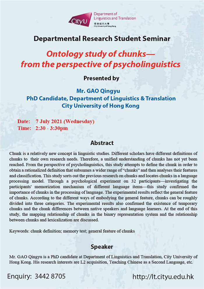 Departmental Research Student Seminar: "Ontology study of chunks—from the perspective of psycholinguistics" Event Date: 07 Jul 2021 Event Time 02:30 PM - 03:30 PM Venue: Online via Zoom Body LT Support